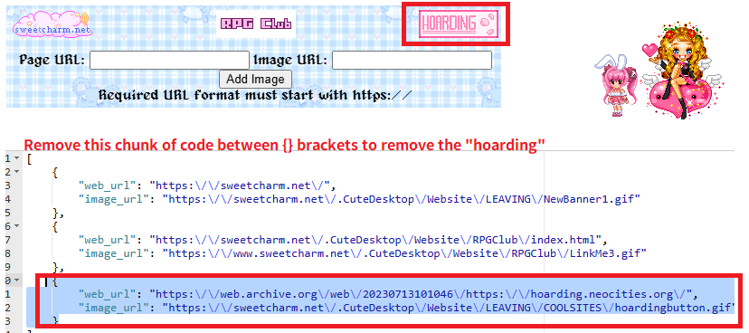 I need to remove the chunk of code between curly brackets {} that has HOARDING's button image URL, and the site URL.
