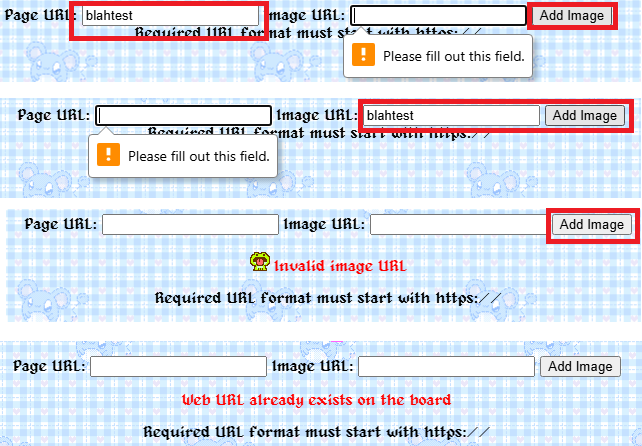 Time to see if it worked! Here are some examples of errors you might get if you don't put the correct format for images and URLs, if you only fill out one of the fields and not the other, or if a URL already exists on the board: